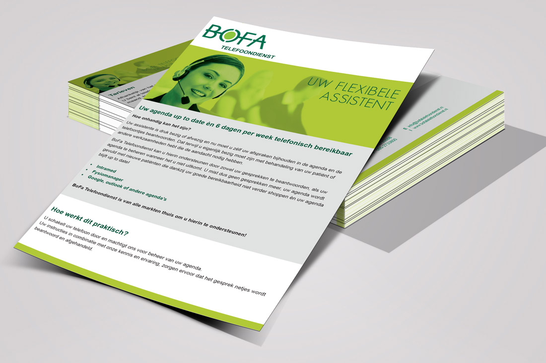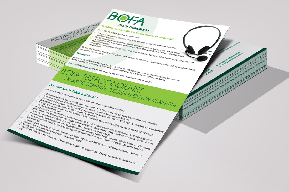 In lijn met de vormentaal uit de huisstijl heeft Mediascape voor BOFA Telefoondiensten A4 flyers ontworpen.